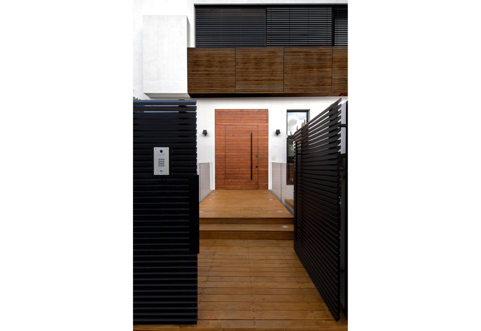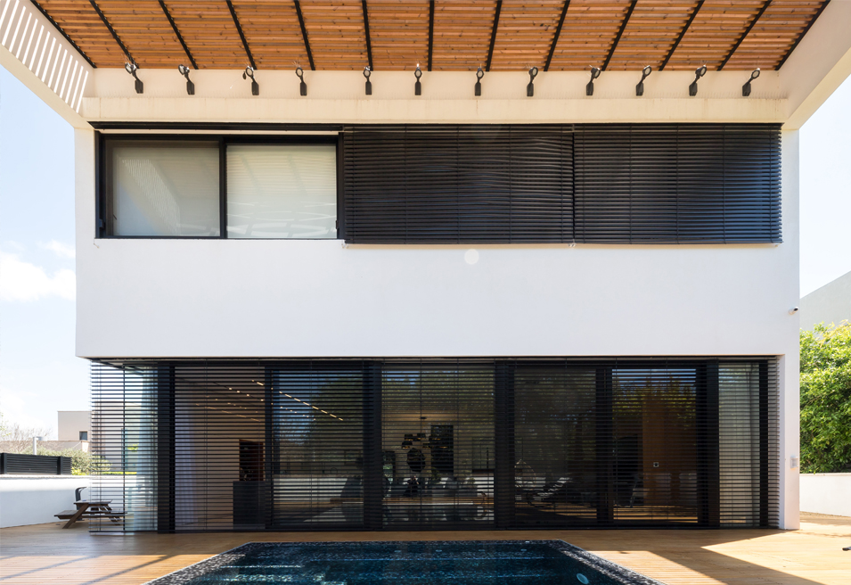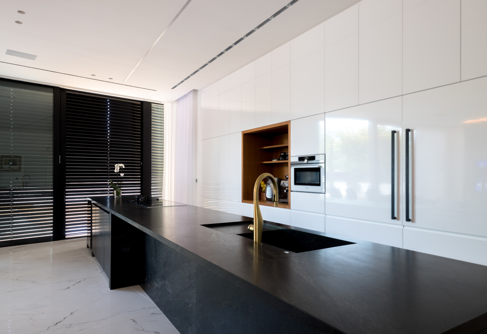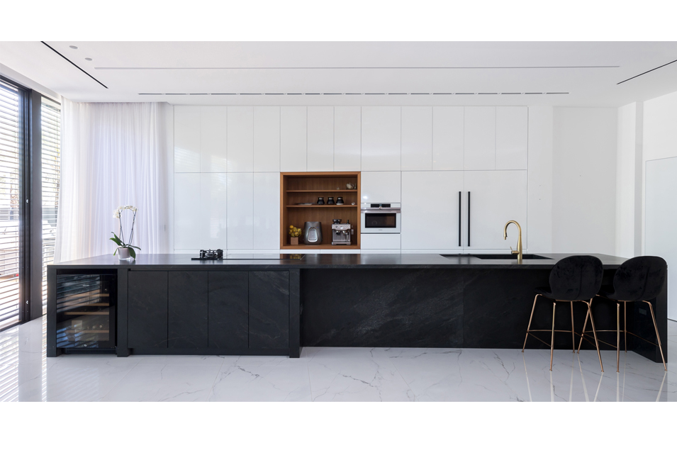 עם המגרש והבית במשמר השבעה יש לי היכרות אינטימית ארוכת שנים. על תכנון הבית התחלתי לעבוד עוד כשכיר במשרדו של אלכס מייטליס עבור לקוח שבסיום תהליך הוצאת ההיתר לבית קפא על שמריו. כמה שנים אחר כך כשכבר פעלתי כמשרד עצמאי ביקש ממני אלכס בשל היכרותי עם התהליך שעבר המגרש לעבוד איתו בשיתוף פעולה על שלבי המכרז והביצוע לבית רק שעבור זוג לקוחות חדש שרכש את המגרש והתלהב מהתכנון והעיצוב שהצענו במקור. עיצוב הבית המחולק לשלוש קומות מאופיין בחומרי גמר עשירים מבחוץ ומבפנים. עץ תיק בורמזי כחיפויי חוץ, דק, פרגולות ואפילו דלת הכניסה במעטפת החיצונית חוזר כחומר גמר מרכזי לחיפויי קיר, ריצוף, מדרגות ורהיטים בתוך הבית. חלונות הבית במפתחים גדולים בוצע באלומיניום שחור מעולגן (אנודייז). קומת הכניסה היא חלל אחד פתוח עם חזית חלונות מלאה לחצר. בצידה האחד קיר המטבח הלבן ולפניו האי הדומיננטי, ארוך ומונוליטי בגמר אבן גרניט שחורה. האי מכיל בתוכו אזור ישיבה, מקרר יין, כיור, כיריים ואביזרים נוספים בעוד קיר הארונות הלבן מכיל שטח איחסון גדול ומסתיר בתוכו שני מקררים רחבים.