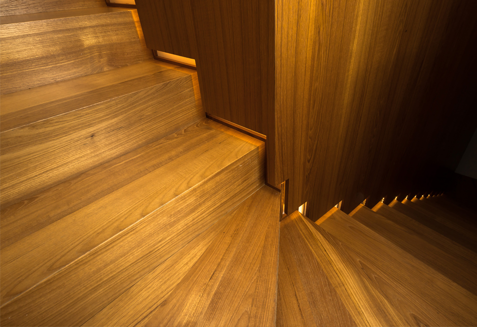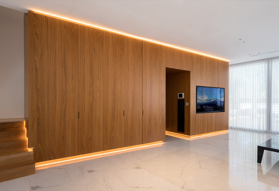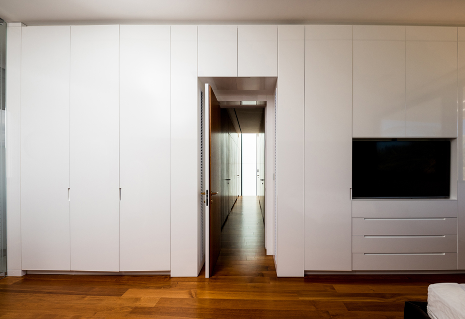 בצידה השני של הקומה ניצב קיר נגרות משולב בחיפוי קיר המסתיר בתוכו ארונות מעילים ונעליים המשרתים את הכניסה לבית, ארונות סמויים למערכות חשמל ותקשורת, מעברים למדרגות העליה והירידה לשתי הקומות הנוספות, זרוע למסך טלביזיה ענק ואת דלת הכניסה לשירותי האורחים. אלמנט זה ממשיך למעשה לעטוף את חלל המדרגות העולות לקומה העליונה והופך בהמשכו לחיפוי הקיר במסדרון הקומה העליונה הכולל בתוכו חמש דלתות סמויות לחדרי השינה וחדר הרחצה ולארונות שירות קומתיים. שאר הקומה מחולקת לחדר ההורים, סוויטה קטנה ושני חדרי שינה נוספים.