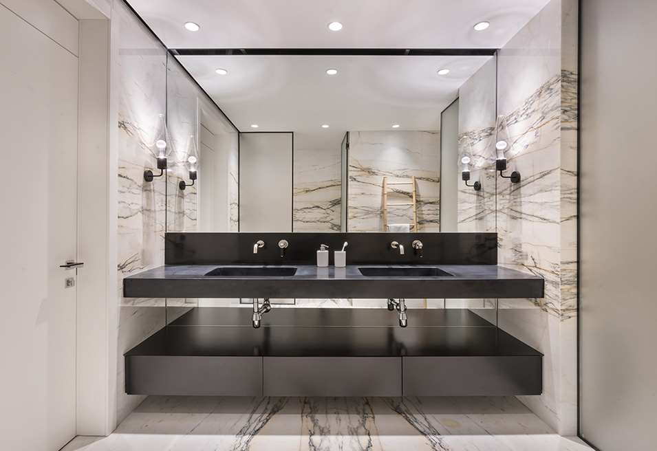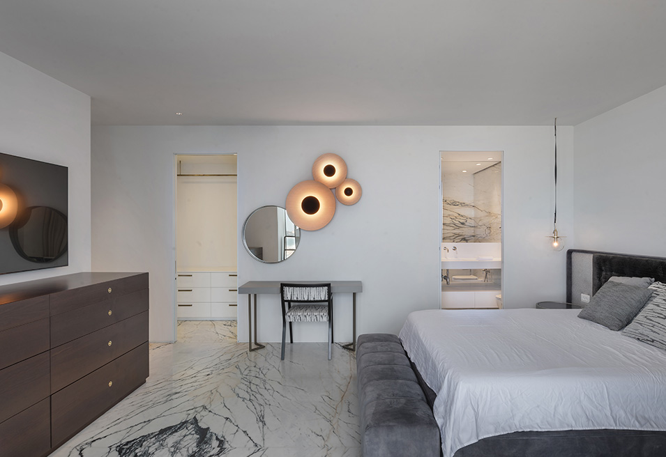 גם בחדרי הרחצה משמש השיש כריצוף וכחיפוי לקירות. קירות בחיפוי מראה מדגישים את משטח הכיורים ורהיט המגירות המרחפים ומוסיפים תחושת עומק ומרחב. מקלחוני הזכוכית מודגשים במסגרות ברזל עדינות. חדר המאסטר מאופיין גם הוא בחומרים המרכזיים של הבית. ריצוף בשיש פאונצו טבעי וריהוט בעץ ערמון מעושן. מהחדר נשקף כמובן הנוף אך גם חדר הרחצה וחדר הארונות. גופי תאורה מרהיבים נותנים את נגיעות הצבע ומדגישים את חלוקת החלל וגם כאן שימוש בטקסטיל מכניס רוך וחמימות מאזנים ומשלימים.