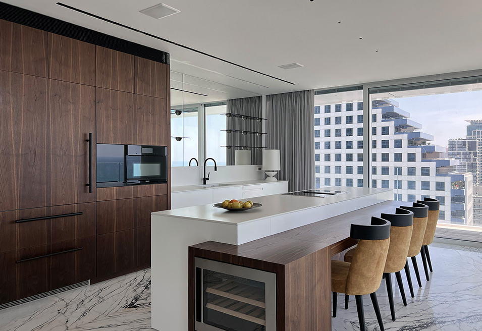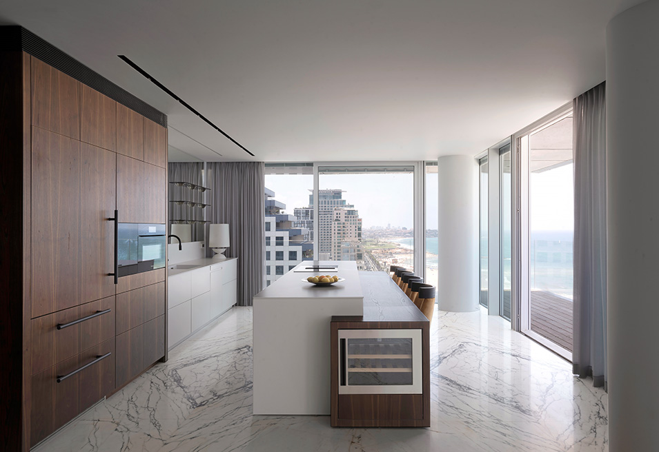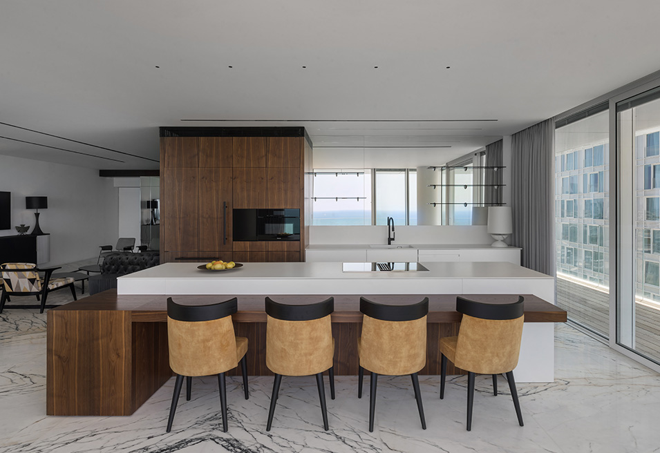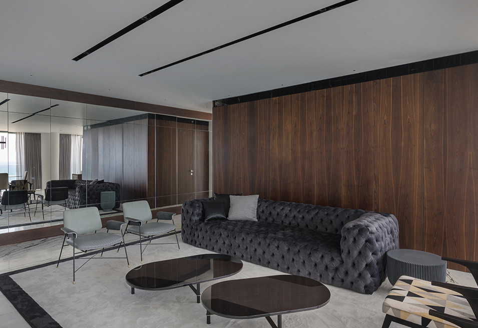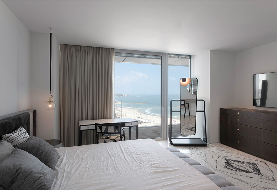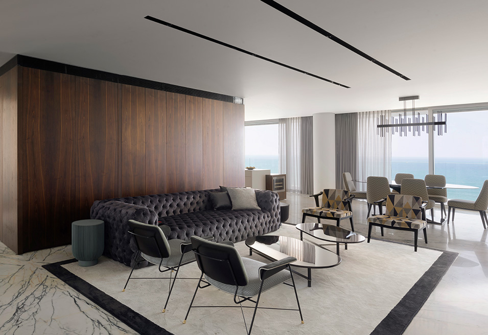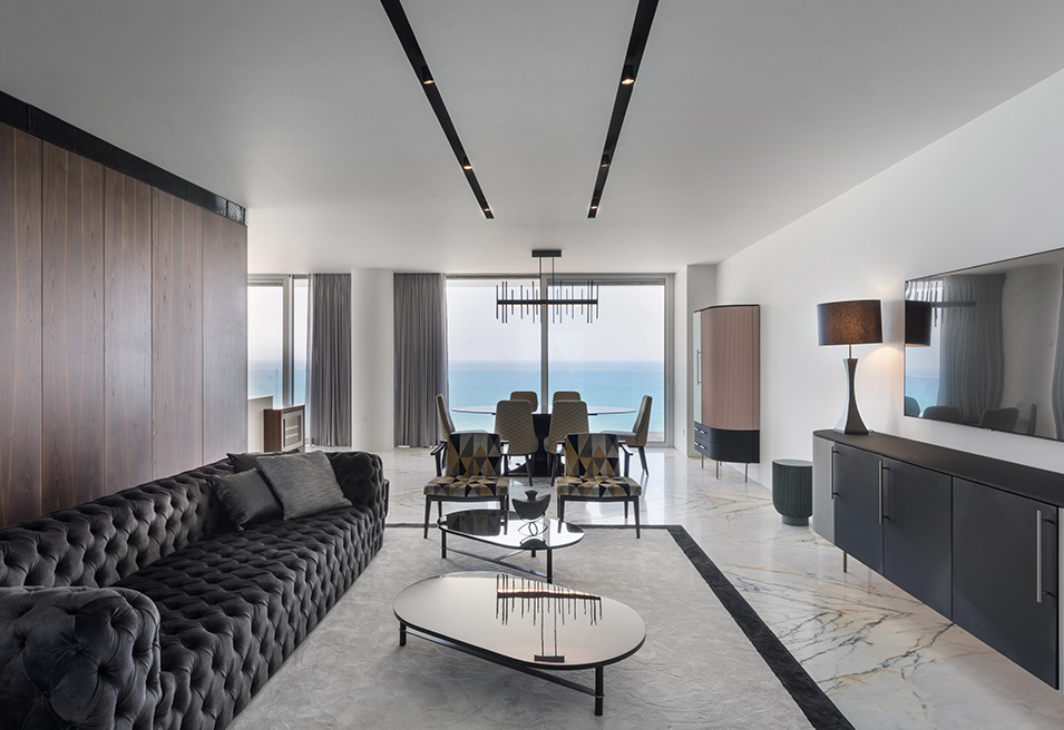 החלל הפתוח שנוצר איפשר למקם אזורי שהייה שונים ברחבי הדירה עם חציצה ויזואלית "רכה" בינהם שאיפשרה מתן דגשים עיצוביים שונים לכל איזור אך עם קו מקשר העובר בינהם. בנוסף שימוש במראות כחיפויי קיר מכניס את הים אל תוך הדירה ומעצים את חווית הנוף. בסלון אלמנט הקיר המרכזי המשלב את הקמין, מדפים בעץ ומסגרות משלב את עץ הערמון עם רקע לבן, נגיעות פליז וברזל טרנסמיסיה שחור. פאלטת הצבעים שאבה השראה משיש הפאונצו תוך שימוש בגווני הגידים המופיעים בו באופן טבעי. בחירת הריהוט והטקסטיל לדירה נעשו גם הם תוך שאיבת השראה מגווני השיש הטבעיים בעוד הם משמשים רקע לאמנות ולריהוט המכניסים כתמי צבע משלימים ורכות מאזנת לחלל.